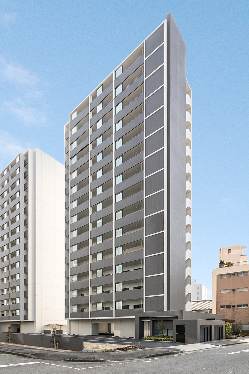 名古屋市東区の約2000平米の角地の15階建て高級感ある高スペック賃貸マンション2棟の建築施工事例です。