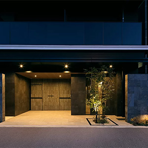 名古屋市昭和区の駅近・約75坪の土地の植栽がありモダンで高級感のあるエントランスの12階建て1K全33戸賃貸マンションの施工事例です。