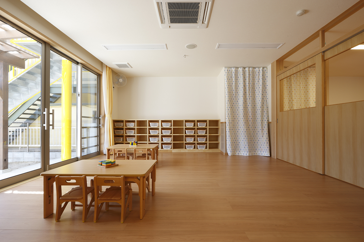保育室には、木の机や棚が設置されており、木のぬくもりが感じられる空間。