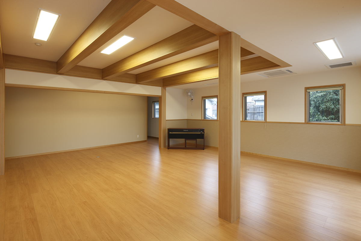 壁の少ない大空間の保育室は、木の梁が見え、ナチュラルな雰囲気に。