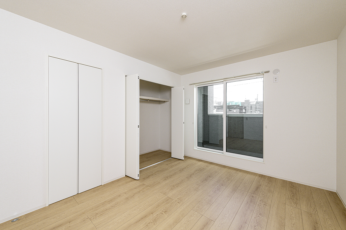 - バルコニーからの光が感じられ壁一面に収納が付いた洋室