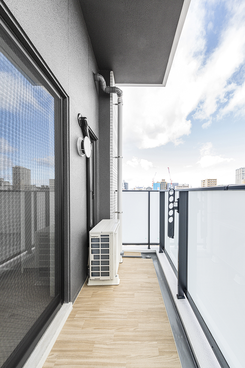 - ワンルームタイプの間取りの半透明のパネルがおしゃれなバルコニー