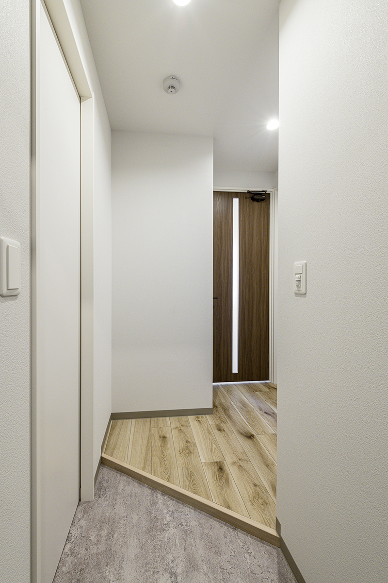 - 駅近1Kのマンションのフローリングに合わせ明るい色のキッチンの玄関ホール