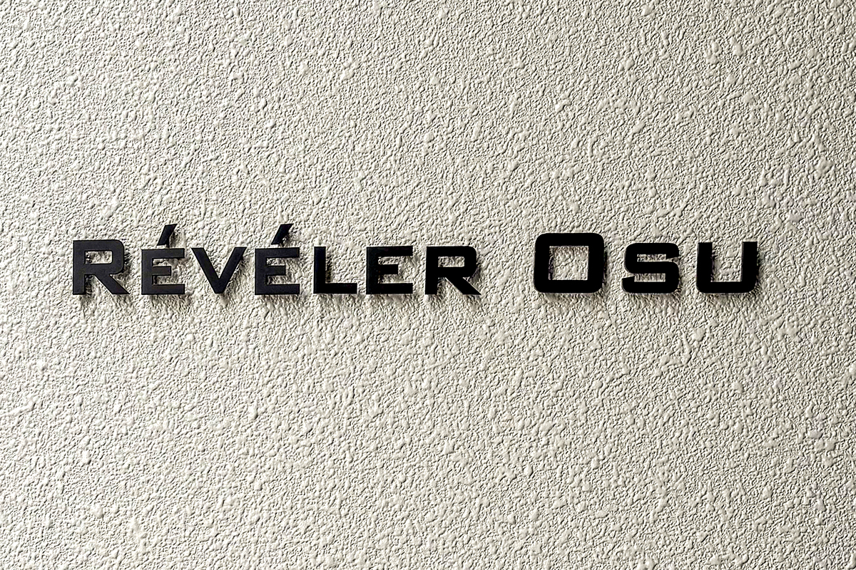 - 壁面の質感とマッドブラックのコントラストを活かした、シンプルな館銘板