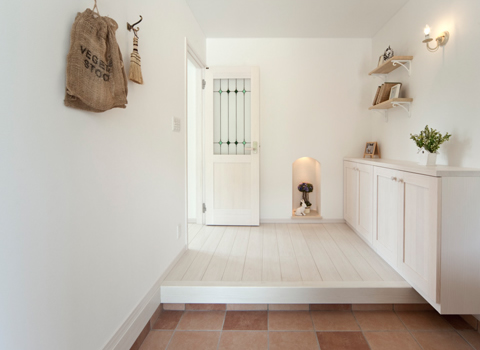 扉を開けて目に入るのは真っ白な玄関ホール。照明やドアのステンドグラスにもこだわった。